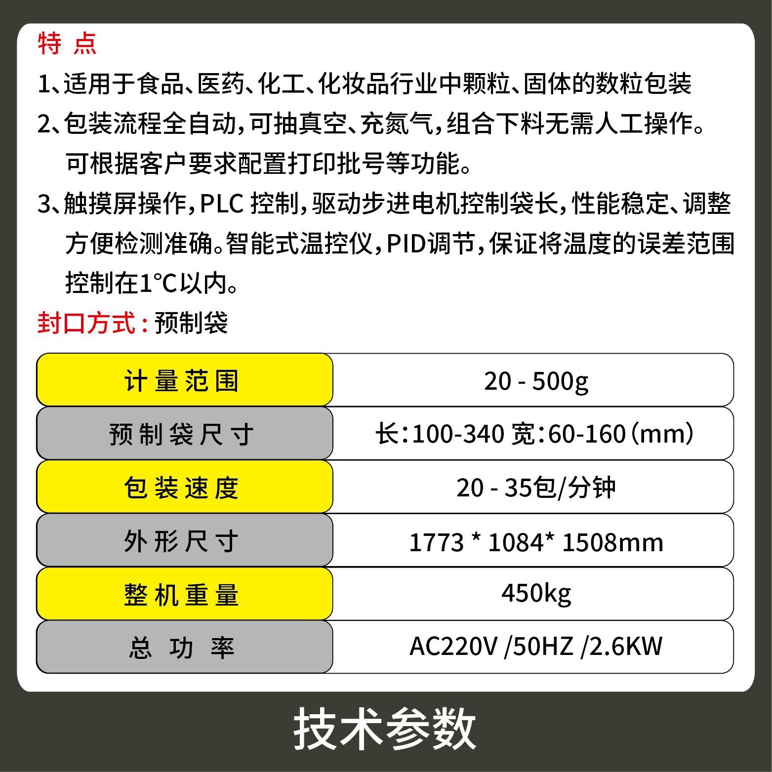 2、包裝流程全自動,無需人工操作,可抽真空、充氮氣,組合下料。可根據(jù)充填物料的性質(zhì)選配不同的下料結(jié)構(gòu),且可根據(jù)客戶要求配置打印批號等功能。