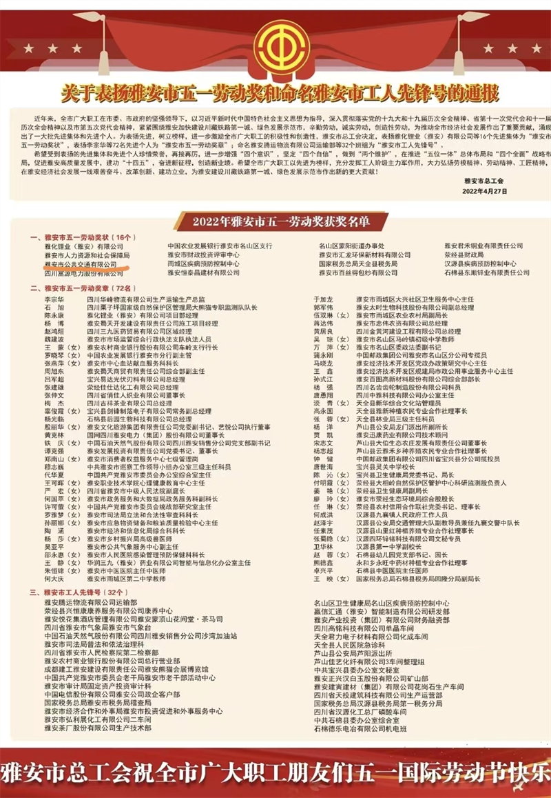 此次大會表彰雅安市五一勞動獎狀16個、雅安市五一勞動獎章72名、雅安市工人先鋒號32個,雅安市公共交通有限公司獲得“雅安市五一勞動獎狀”榮譽稱號。