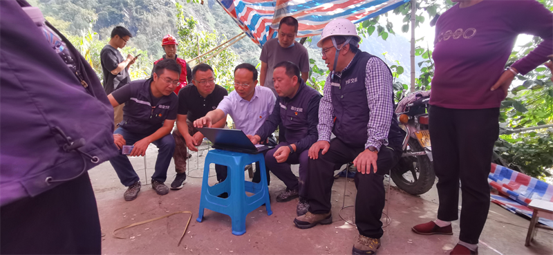 和坪村兩組400余名群眾,遍布于縣道X073兩側(cè)。為全覆蓋掌握該村道路分布、垮塌點位和房屋分布情況,交建集團發(fā)揮技術優(yōu)勢,集團黨委書記、董事長漆家華一線督導、多方協(xié)調(diào),組織5名相關專業(yè)技術人員,累計徒步跋涉20余小時,從6個點位實施無人機多角度航拍,累計拍攝照片1300余張,全覆蓋制作360°實景圖。并結(jié)合走訪入戶情況,對全村137處村民房屋進行精準定位,繪制具體房屋布置圖,為市縣包保工作組精準開展工作提供有力的技術支撐。