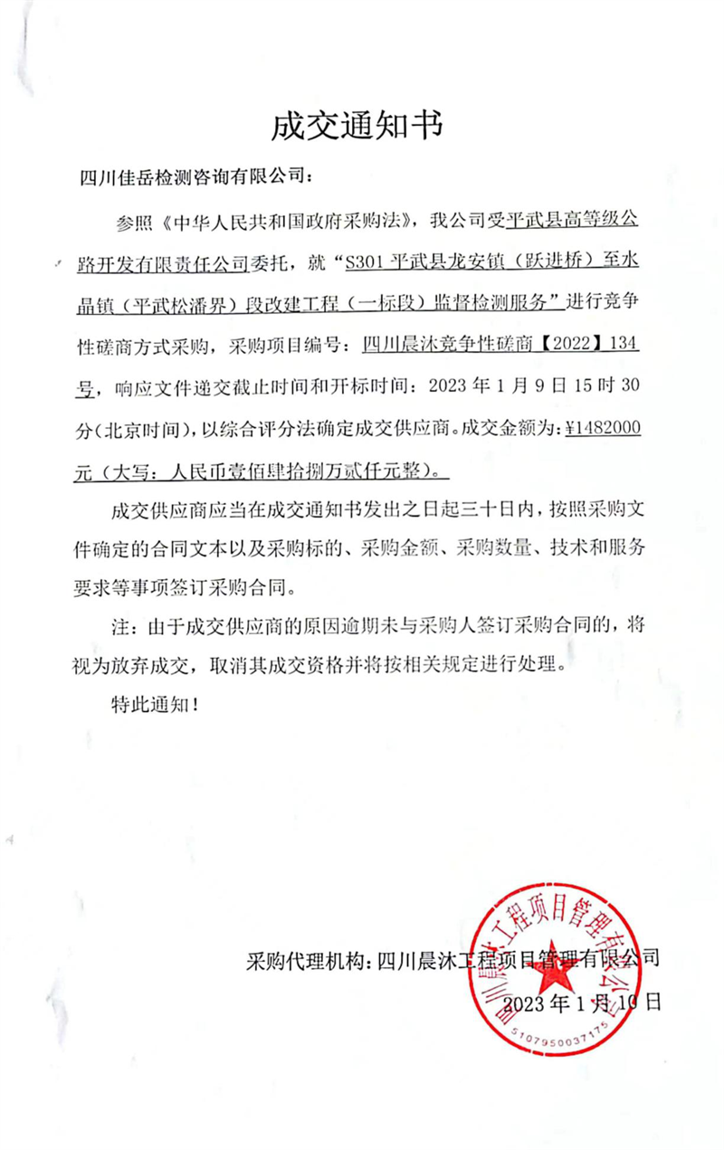 新年新業(yè)績(jī) 兔年新氣象 四川佳岳檢測(cè)咨詢有限公司中標(biāo)首個(gè)市外檢測(cè)項(xiàng)目