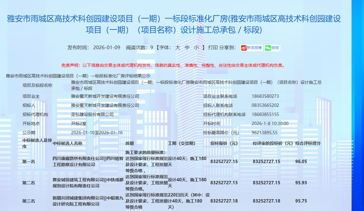 蓄勢突破,奮楫開新。康藏路橋公司成功斬獲雅安市雨城區(qū)高技術科創(chuàng)園建設項目(一期)一標段標準化廠房項目,中標金額8325.27萬元,為公司2026年發(fā)展強勢開篇,迎來馬年“開門紅”。