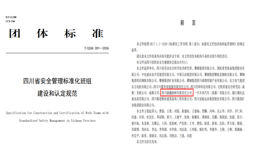 近日,由四川省職業(yè)安全健康協(xié)會(huì)牽頭編制的《四川省安全管理標(biāo)準(zhǔn)化班組建設(shè)和認(rèn)定規(guī)范》(T/CZAX001—2026)正式發(fā)布,康藏路橋公司作為四川省建筑施工領(lǐng)域的代表企業(yè),全程深度參與該標(biāo)準(zhǔn)的編寫(xiě)工作。