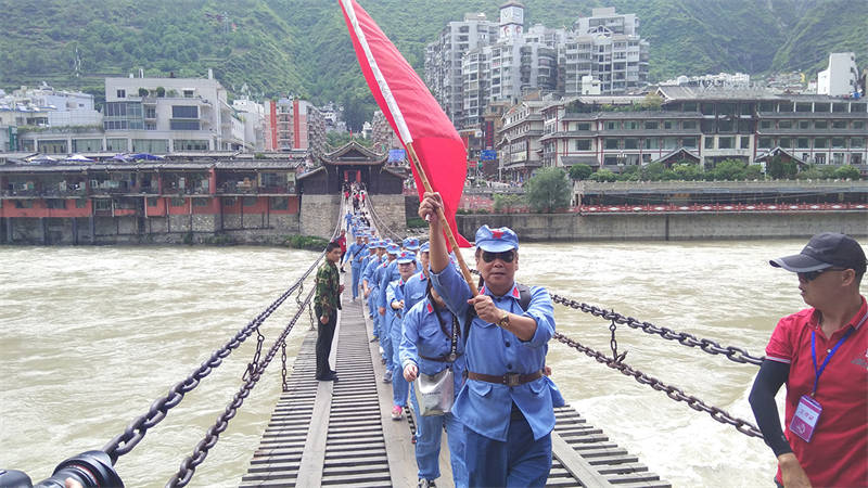 活動(dòng)中,全體黨員干部職工換上紅軍服、戴上紅軍帽,走上瀘定橋,觸摸著沾染了無數(shù)革命烈士鮮血的鐵索,瞬間將大家的思緒拉回到1935年的529日,22名勇士冒著敵人的槍林彈雨,攀著鐵鏈沖向?qū)Π,英勇奪下瀘定橋,取得長(zhǎng)征中的一次決定性勝利場(chǎng)景。大家無不被革命先輩的英勇與無畏所震撼。