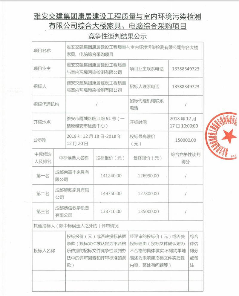 綜合大樓家具、電腦綜合采購項目競爭性談判結果公示
