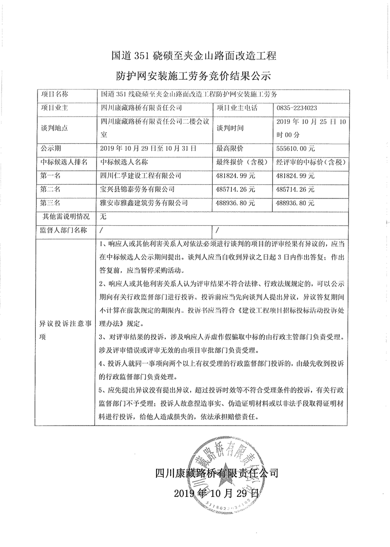 四川康藏路橋有限責任公司國道351磽磧至夾金山路面改造工程防護網(wǎng)安裝施工勞務(wù)競價結(jié)果公示