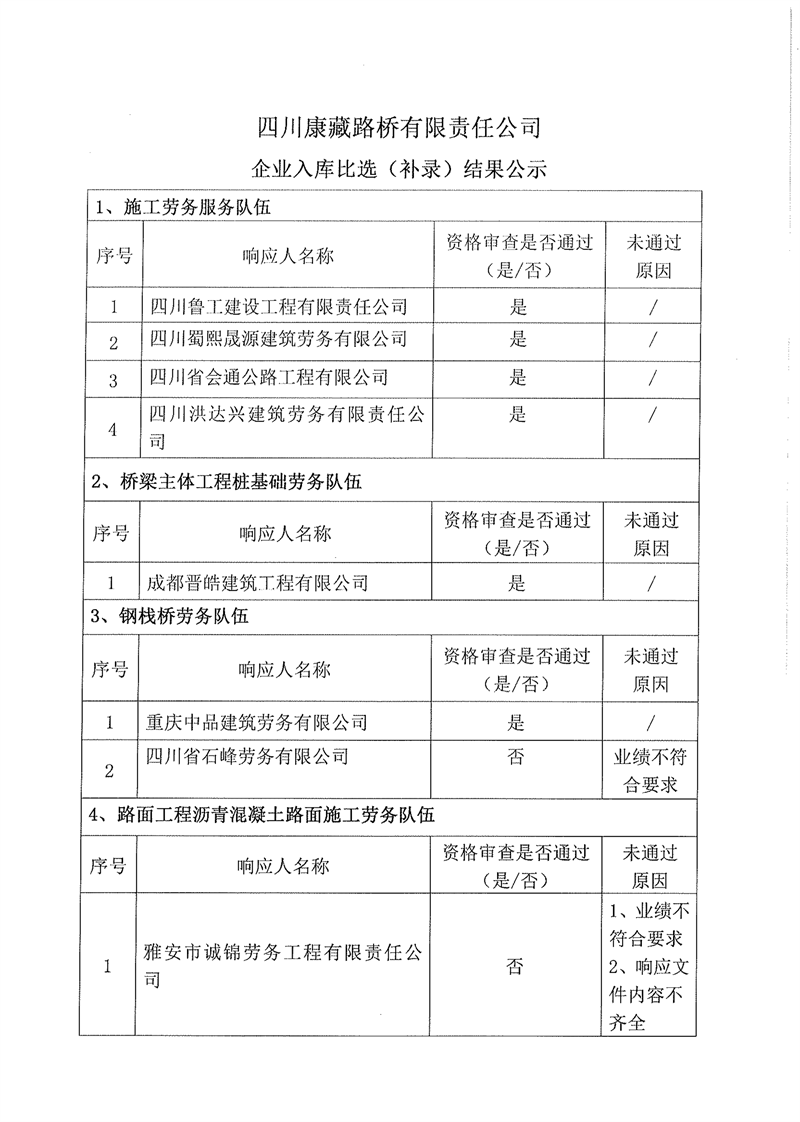 四川康藏路橋有限責(zé)任公司企業(yè)入庫比選(補(bǔ)錄)結(jié)果公示