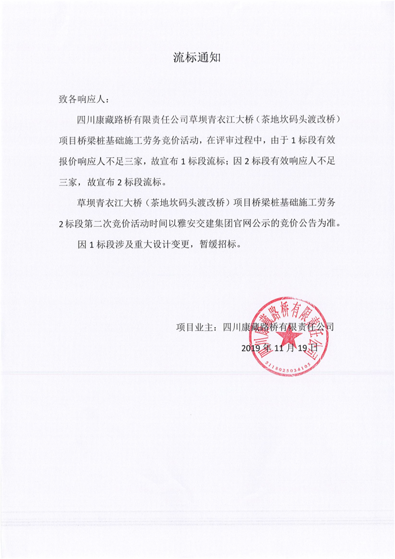四川康藏路橋有限責(zé)任公司草壩青衣江大橋(茶地坎碼頭渡改橋)項(xiàng)目橋梁樁基礎(chǔ)施工勞務(wù)競價(jià)(1標(biāo)段、2標(biāo)段)流標(biāo)通知