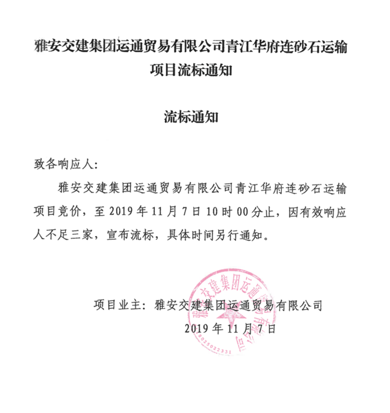 雅安交建集團運通貿(mào)易有限公司青江華府砂石運輸項目流標通知