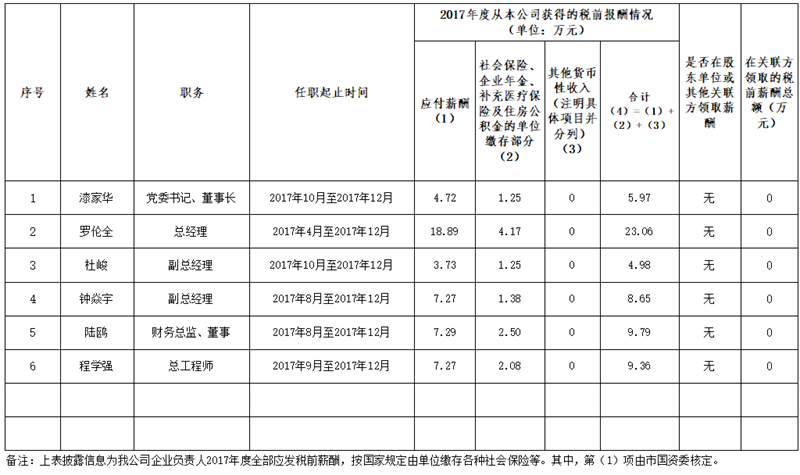 雅安市交通建設(集團)有限責任公司企業(yè)負責人2017年度薪酬情況公示表