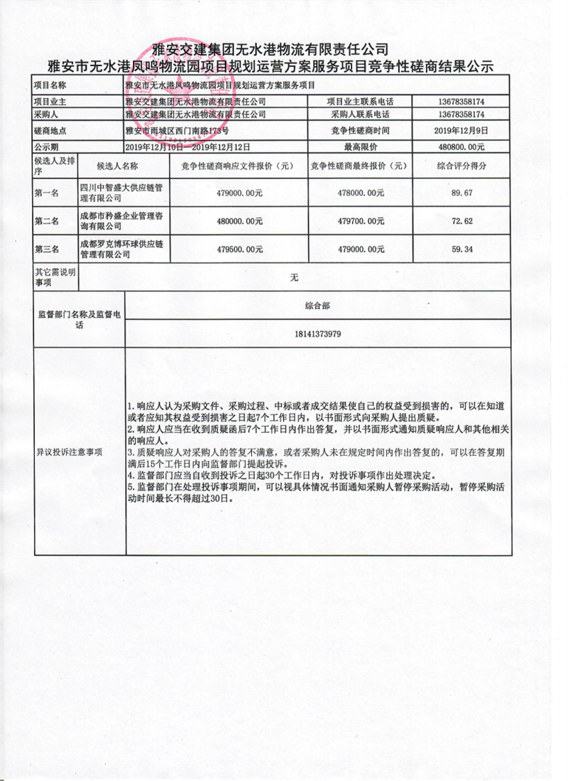 雅安交建集團(tuán)無水港物流有限責(zé)任公司雅安市無水港鳳鳴物流園項目規(guī)劃運營方案服務(wù)項目競爭性磋商結(jié)果公示