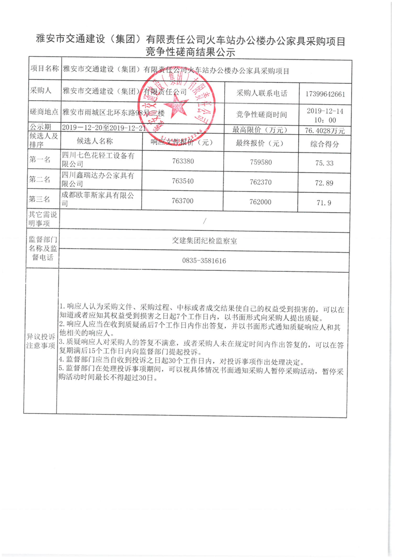 雅安市交通建設(shè)(集團(tuán))有限責(zé)任公司火車站辦公樓辦公家具采購項(xiàng)目競爭性磋商結(jié)果公示