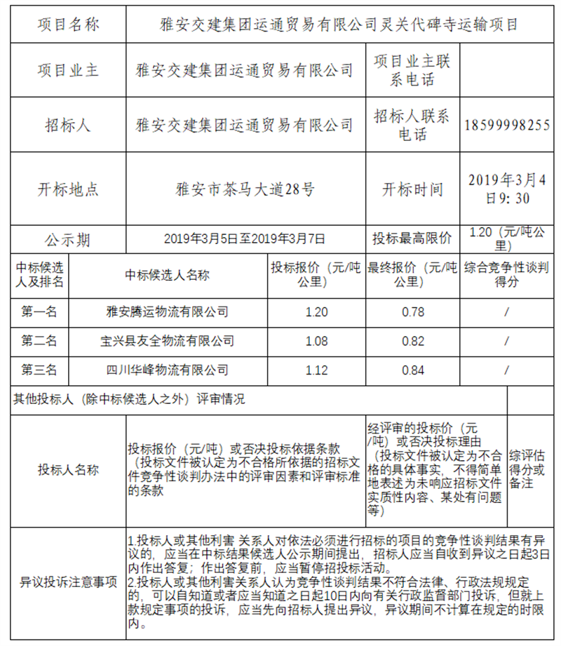 雅安交建集團運通貿(mào)易有限公司靈關(guān)代碑寺運輸項目競爭性談判結(jié)果公示