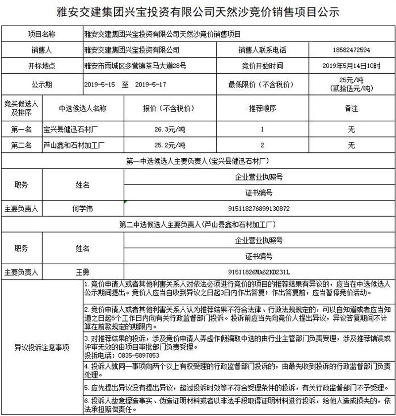 雅安交建集團(tuán)興寶投資有限公司天然沙競(jìng)價(jià)銷售項(xiàng)目公示