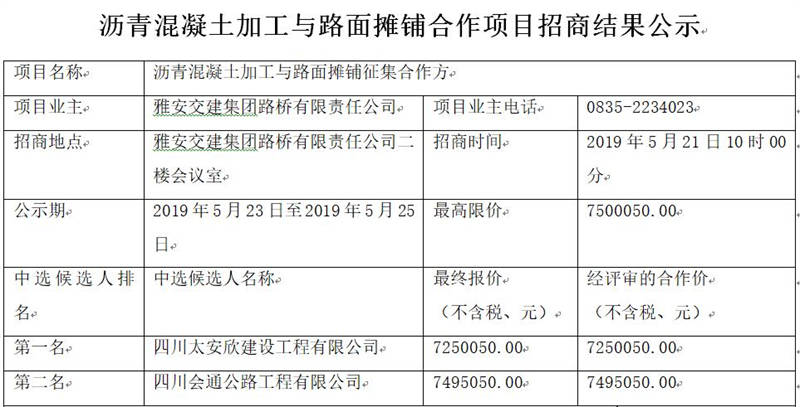 雅安交建集團路橋有限責(zé)任公司瀝青混凝土加工與路面攤鋪合作項目招商結(jié)果公告
