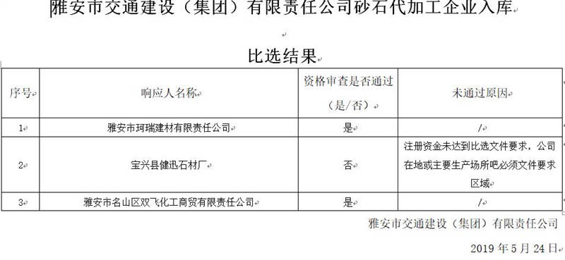 雅安市交通建設(集團)有限責任公司砂石代加工企業(yè)入庫比選結果公示
