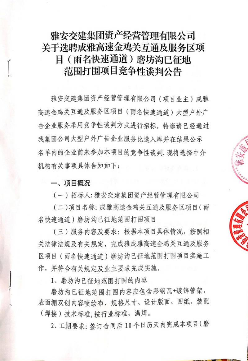 雅安交建集團(tuán)資產(chǎn)經(jīng)營管理有限公司關(guān)于選聘成雅高速金雞關(guān)互通及服務(wù)區(qū)項(xiàng)目(雨名快速通道)磨坊溝已征地范圍打圍項(xiàng)目競(jìng)爭(zhēng)性談判公告