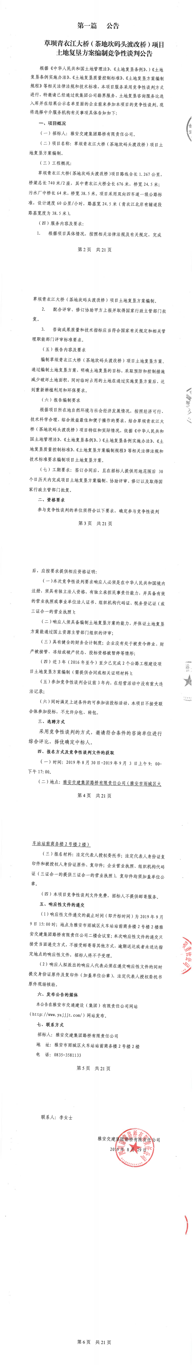 雅安交建集團路橋有限責任公司草壩青衣江大橋(茶地坎碼頭渡改橋)土地復(fù)墾方案編制競爭性談判公告
