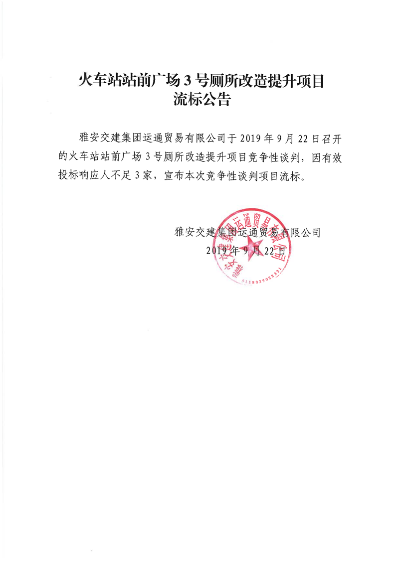 雅安交建集團運通貿易有限公司火車站站前廣場3號廁所改造提升項目流標公告