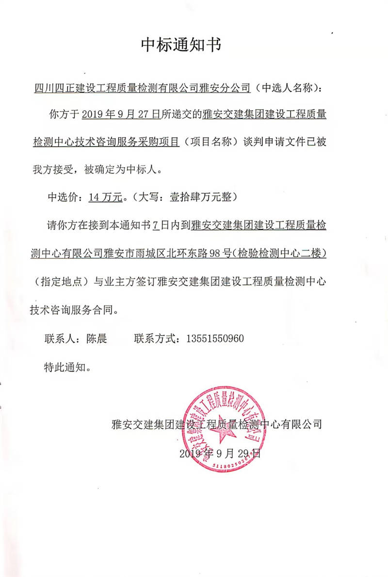 雅安交建集團(tuán)建設(shè)工程質(zhì)量檢測中心技術(shù)咨詢服務(wù)采購項目中標(biāo)公示