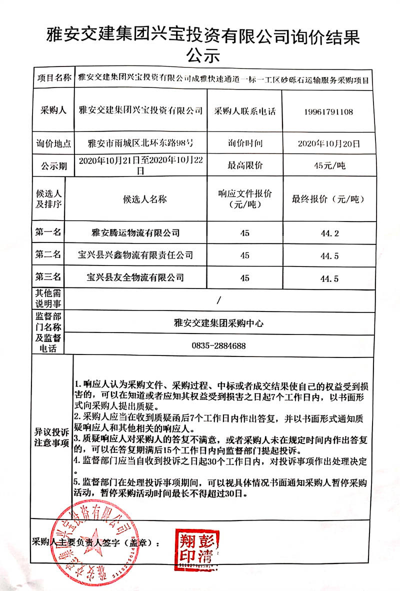 雅安交建集團(tuán)興寶投資有限公司成雅快速通道一標(biāo)一工區(qū)砂礫石運(yùn)輸服務(wù)采購項(xiàng)目詢價結(jié)果公示