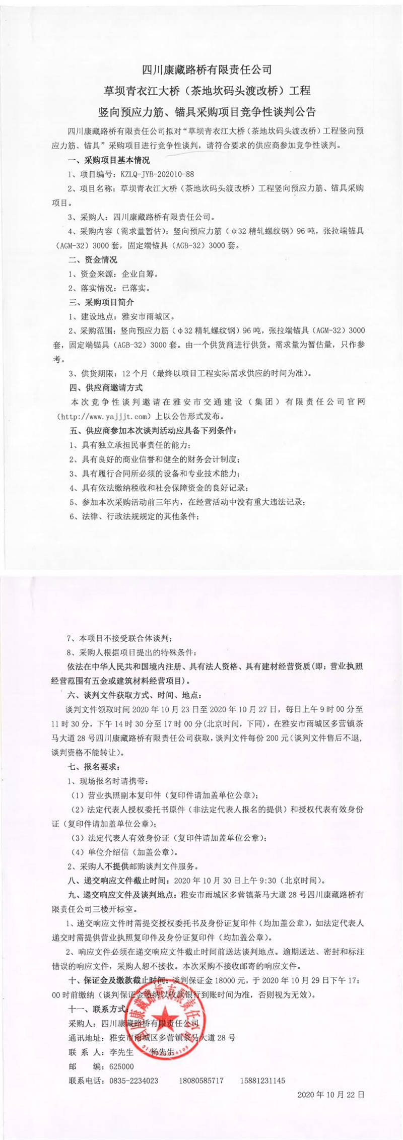 四川康藏路橋有限責(zé)任公司草壩青衣江大橋(茶地坎碼頭渡改橋)工程豎向預(yù)應(yīng)力筋、錨具采購(gòu)項(xiàng)目競(jìng)爭(zhēng)性談判公告