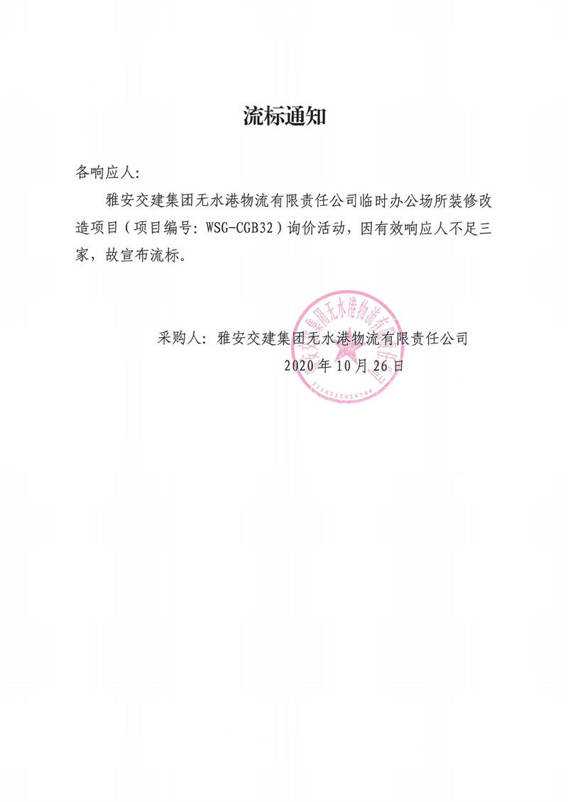 雅安交建集團(tuán)無水港物流有限責(zé)任公司臨時(shí)辦公場所裝修改造項(xiàng)目流標(biāo)通知