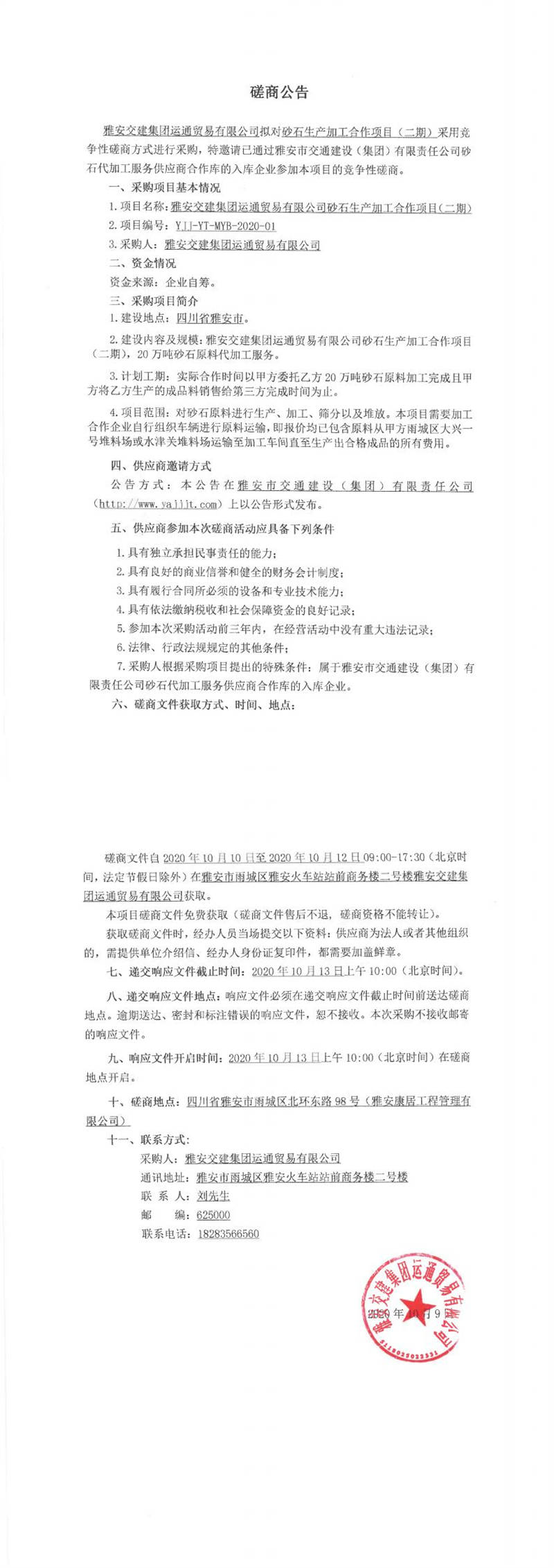 雅安交建集團運通貿易有限公司砂石生產加工合作項目(二期)競爭性磋商公告