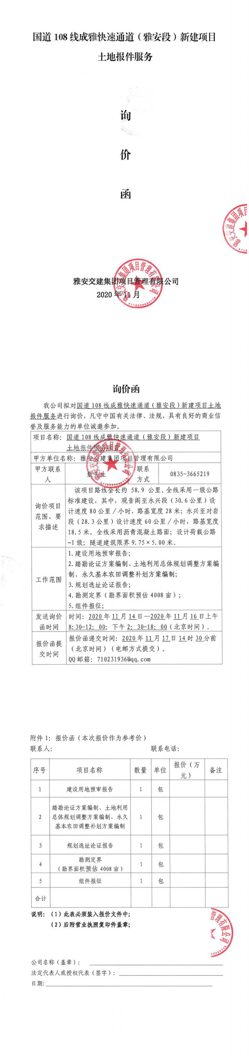 雅安交建集團(tuán)項目管理有限公司國道108線成雅快速通道(雅安段)新建項目土地報件服務(wù)項目詢價函