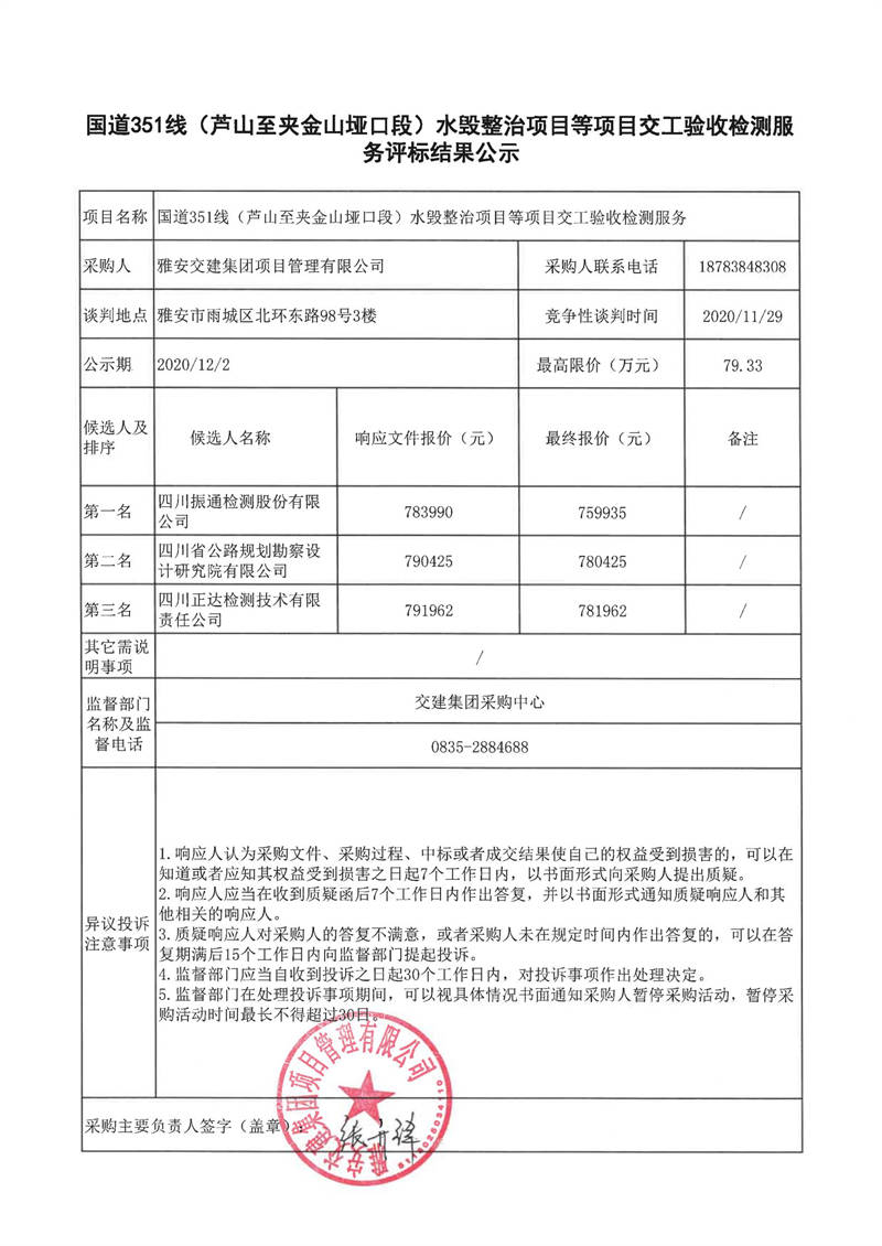 雅安交建集團項目管理有限公司國道351線(蘆山至夾金山埡口段)水毀整治項目等項目交工驗收檢測服務(wù)評標(biāo)結(jié)果公示