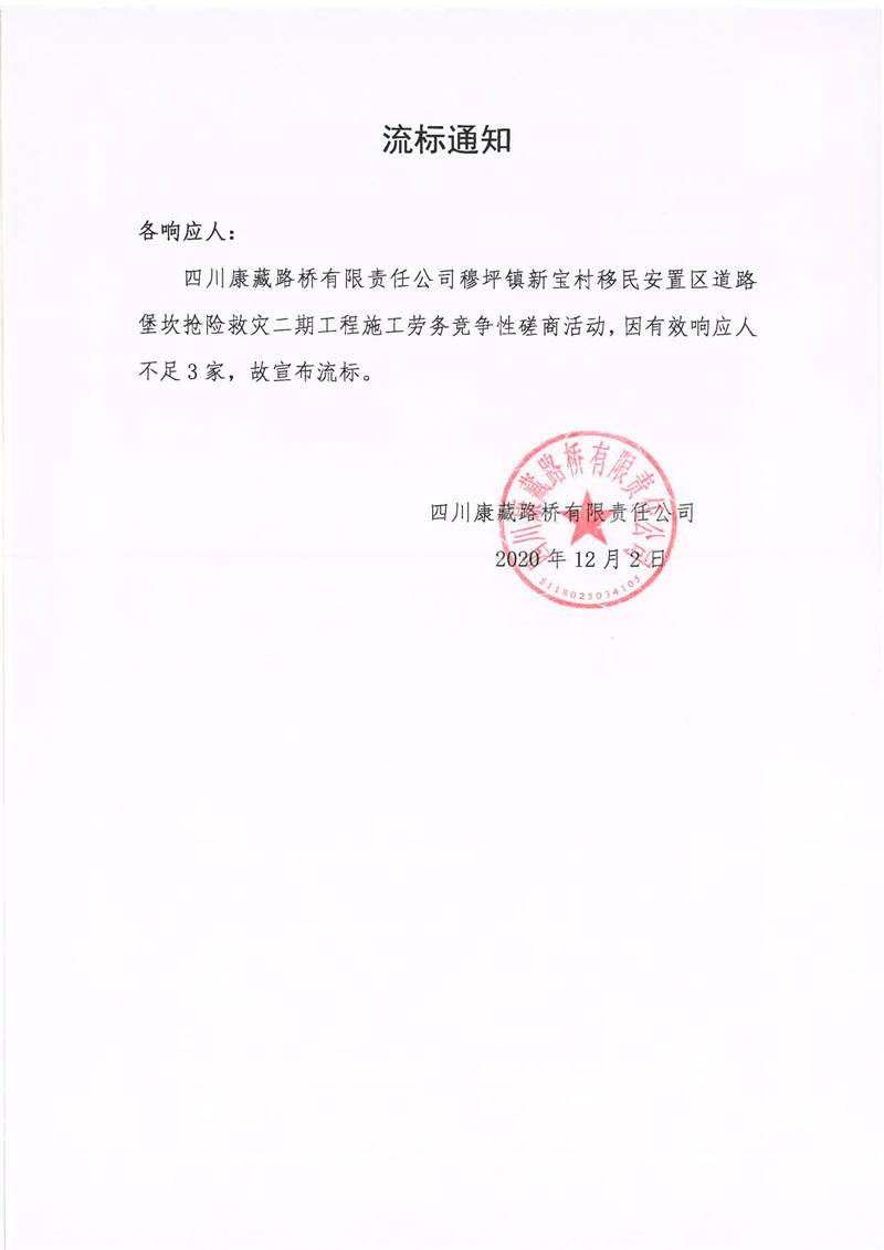 四川康藏路橋有限責(zé)任公司穆坪鎮(zhèn)新寶村移民安置區(qū)道路堡坎搶險救災(zāi)二期工程施工勞務(wù)流標通知