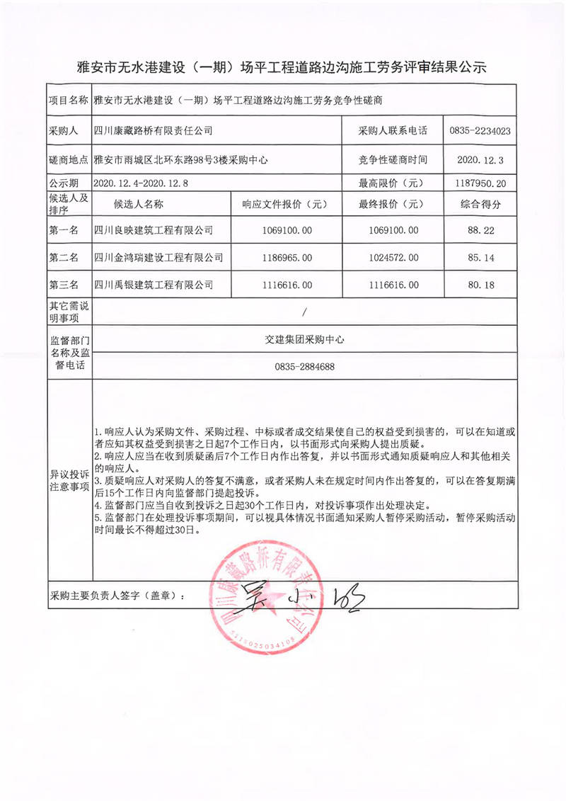 四川康藏路橋有限責(zé)任公司雅安市無水港建設(shè)(一期)場平工程道路邊溝施工勞務(wù)評審結(jié)果公示
