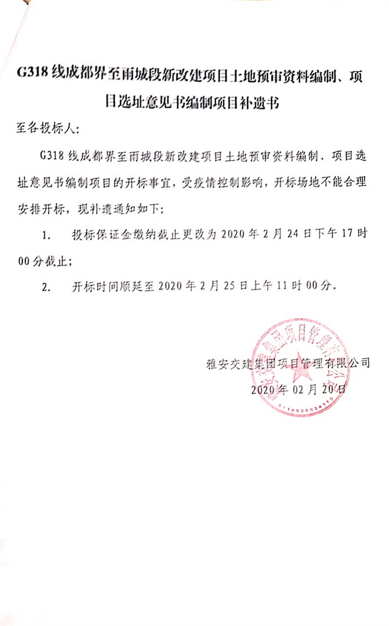 雅安交建集團(tuán)項(xiàng)目管理有限公司G318線成都界至雨城段新改建項(xiàng)目土地預(yù)審資料編制、項(xiàng)目選址意見書編制項(xiàng)目補(bǔ)遺書