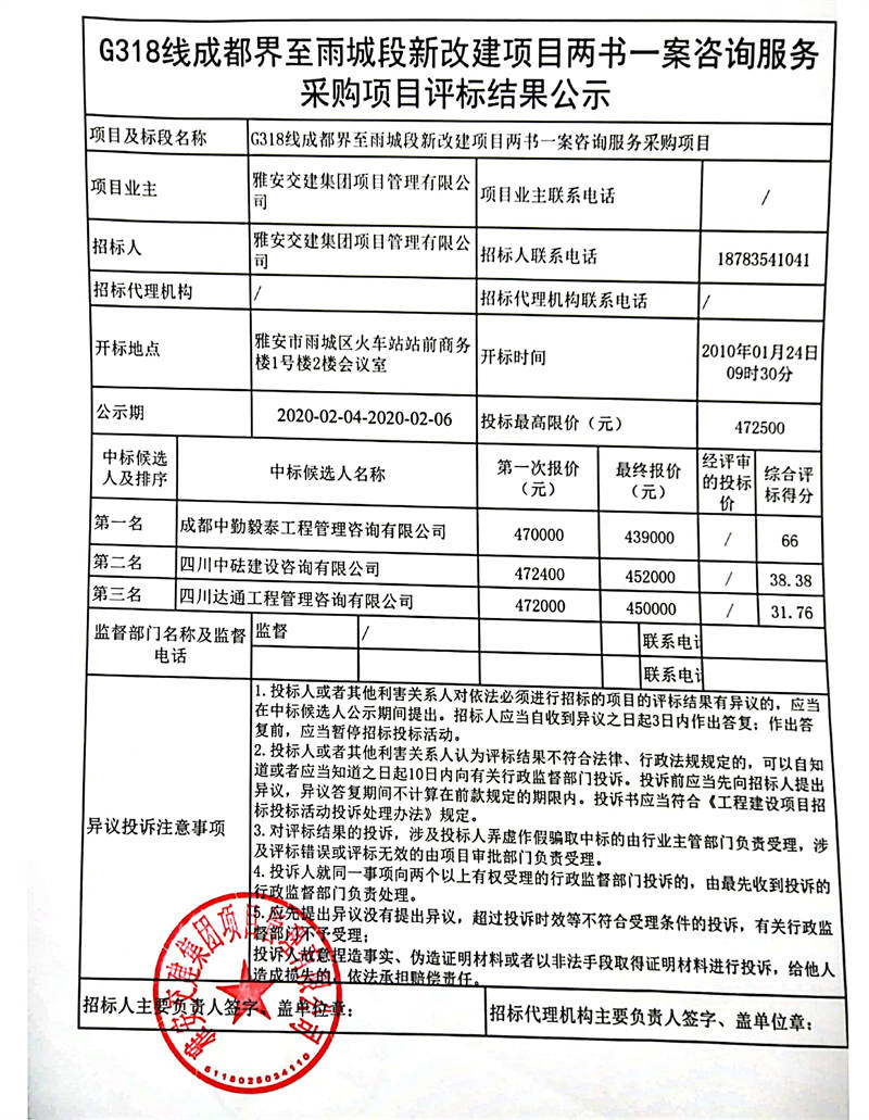 雅安交建集團(tuán)項目管理有限公司G318線成都界至雨城段新改建項目踏勘論證、規(guī)劃修改及基本農(nóng)田調(diào)整補(bǔ)劃、臨時用地復(fù)墾方案編制服務(wù)采購項目評標(biāo)結(jié)果公示