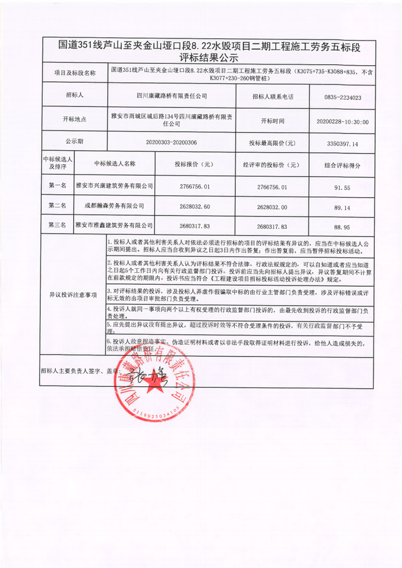 四川康藏路橋有限責(zé)任公司國道351線蘆山至夾金山埡口段8.22水毀項目二期工程施工勞務(wù)五標(biāo)段評標(biāo)結(jié)果公示