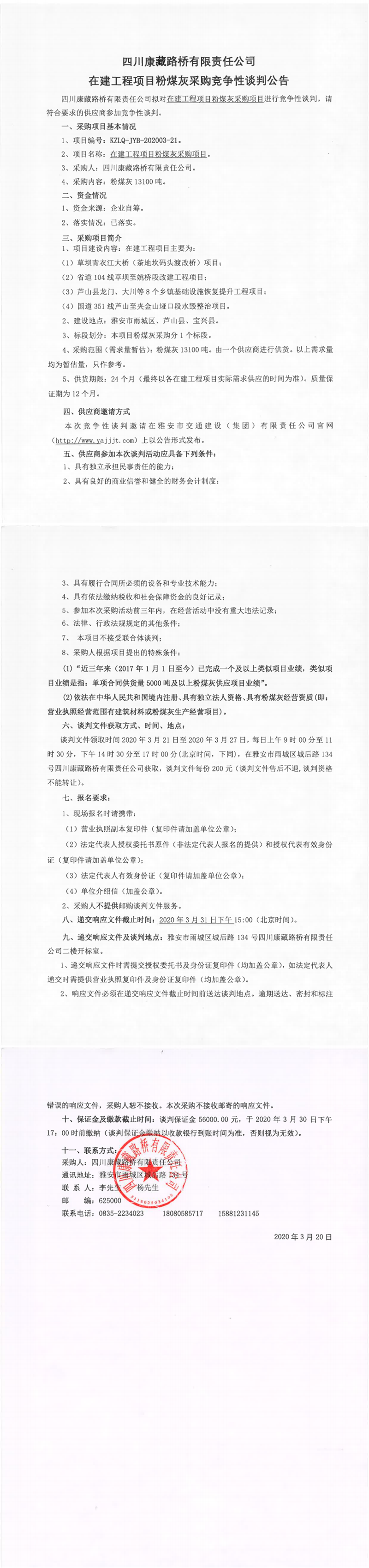四川康藏路橋有限責(zé)任公司在建工程項目粉煤灰采購競爭性談判公告