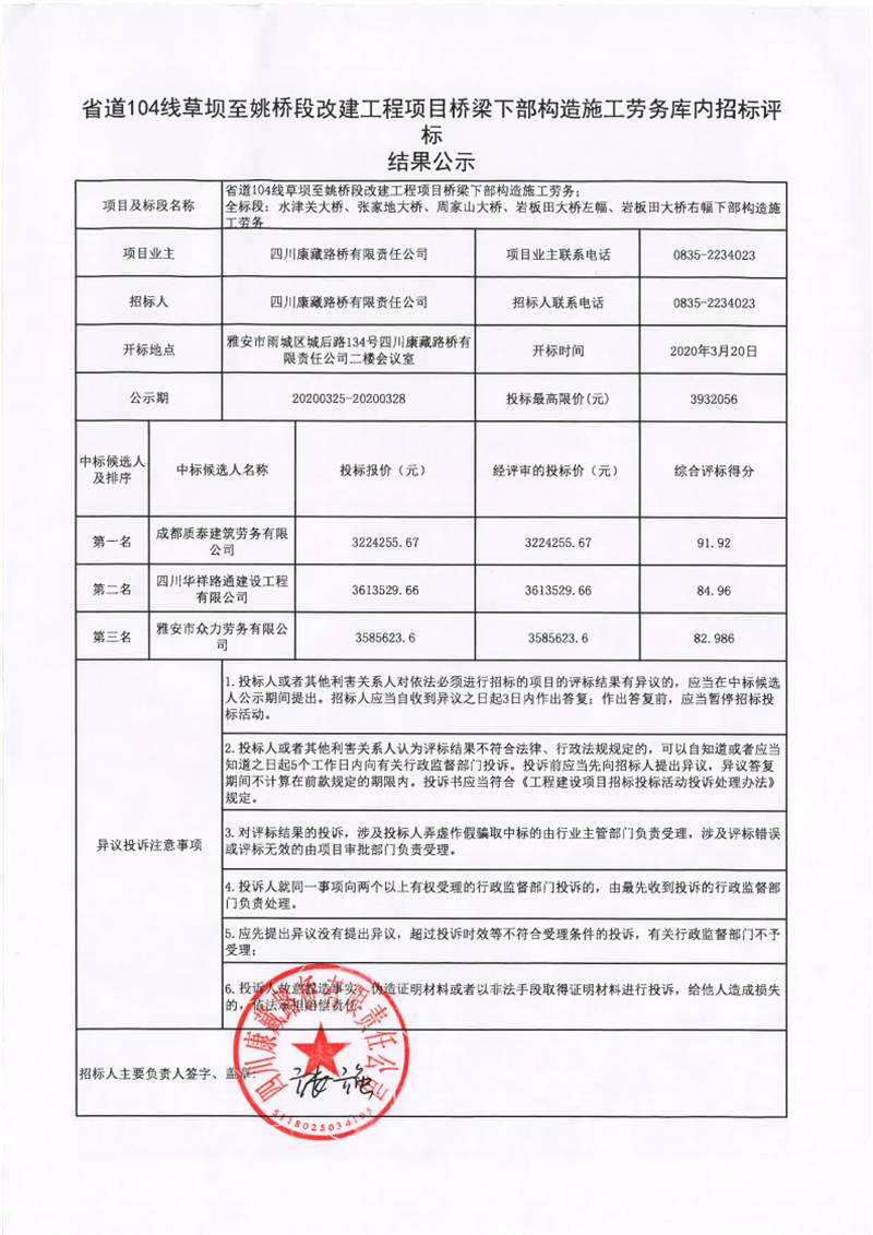 四川康藏路橋有限責(zé)任公司省道104線(xiàn)草壩至姚橋段改建工程項(xiàng)目橋梁下部構(gòu)造施工勞務(wù)評(píng)標(biāo)結(jié)果公示