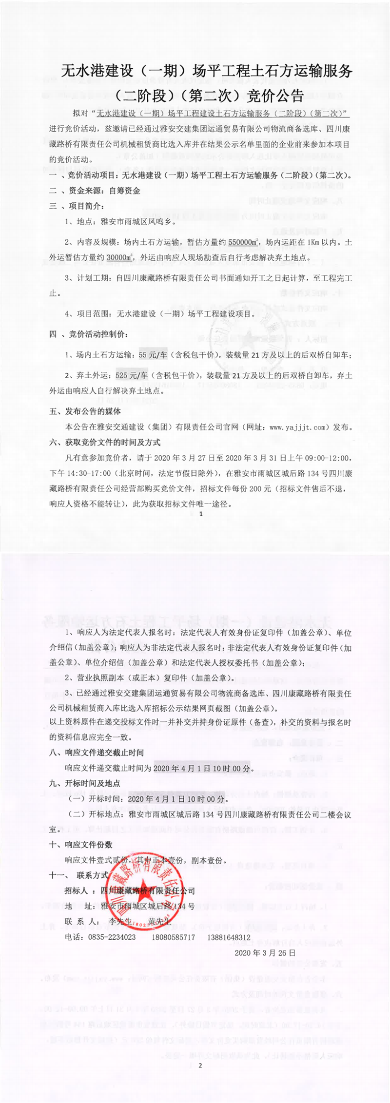 四川康藏路橋有限責(zé)任公司無水港建設(shè)(一期)場平工程建設(shè)土石方運輸服務(wù)(二階段)(第二次)競價公告