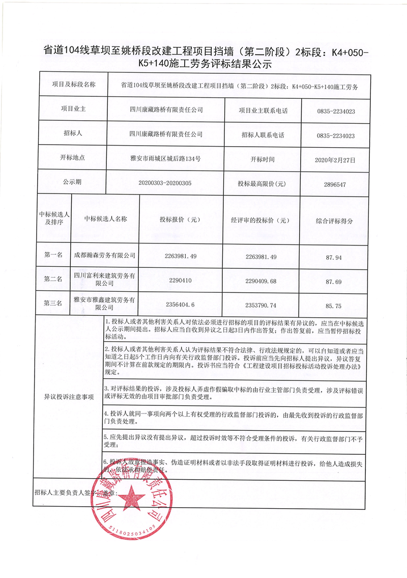 四川康藏路橋有限責任公司省道104線草壩至姚橋段改建工程項目擋墻(第二階段)2標段:K4+050-K5+140施工勞務(wù)評標結(jié)果公示
