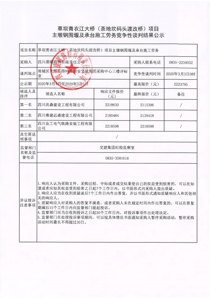 四川康藏路橋有限責任公司草壩青衣江大橋(茶地坎碼頭渡改橋)項目主墩鋼圍堰及承臺施工勞務競爭性談判結(jié)果公示