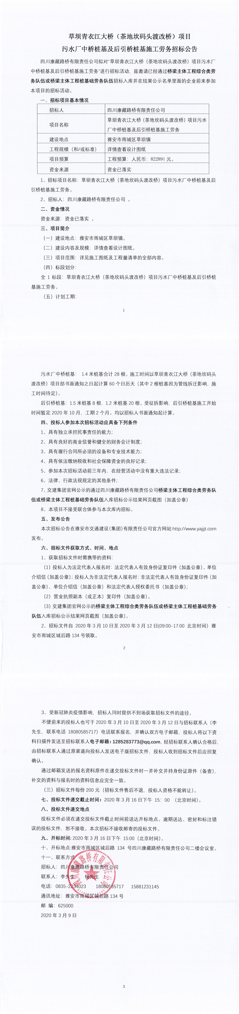 四川康藏路橋有限責(zé)任公司草壩青衣江大橋(茶地坎碼頭渡改橋)項(xiàng)目污水廠中橋樁基及后引橋樁基施工勞務(wù)招標(biāo)公告