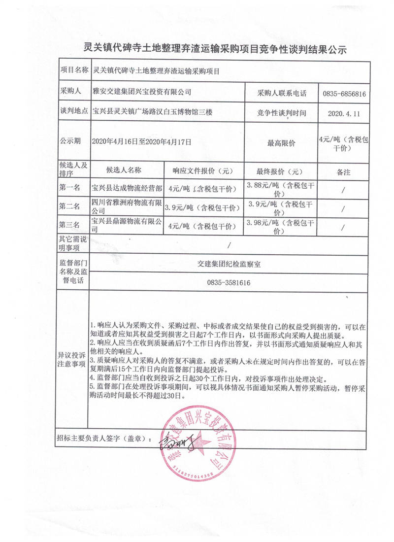 雅安交建集團(tuán)興寶投資有限公司靈關(guān)鎮(zhèn)代碑寺土地整理棄渣運輸采購項目競爭性談判結(jié)果公示