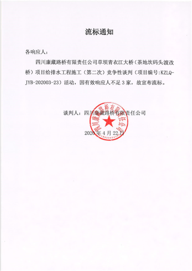 四川康藏路橋有限責(zé)任公司草壩青衣江大橋(茶地坎碼頭渡改橋)項(xiàng)目給排水工程施工(第二次)競(jìng)爭(zhēng)性談判流標(biāo)通知