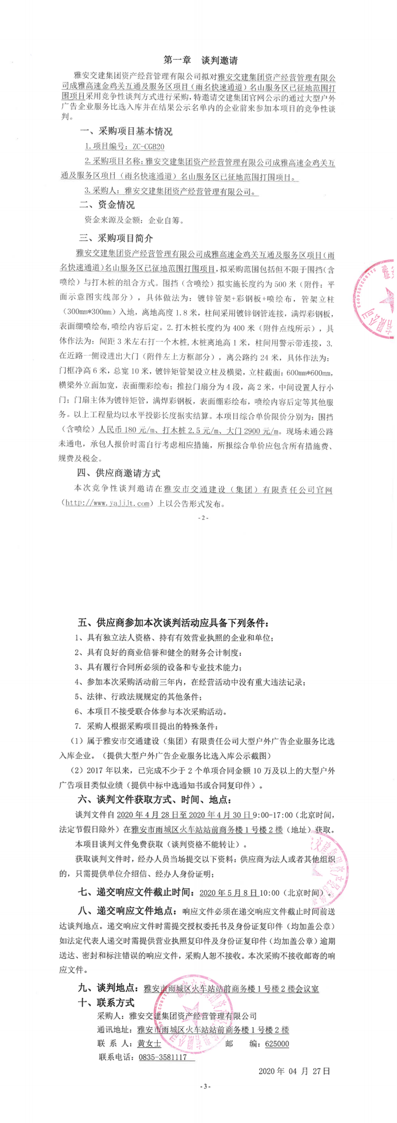 雅安交建集團(tuán)資產(chǎn)經(jīng)營(yíng)管理有限公司成雅高速金雞關(guān)互通及服務(wù)區(qū)項(xiàng)目(雨名快速通道)名山服務(wù)區(qū)已征地范圍打圍項(xiàng)目競(jìng)爭(zhēng)性談判公告