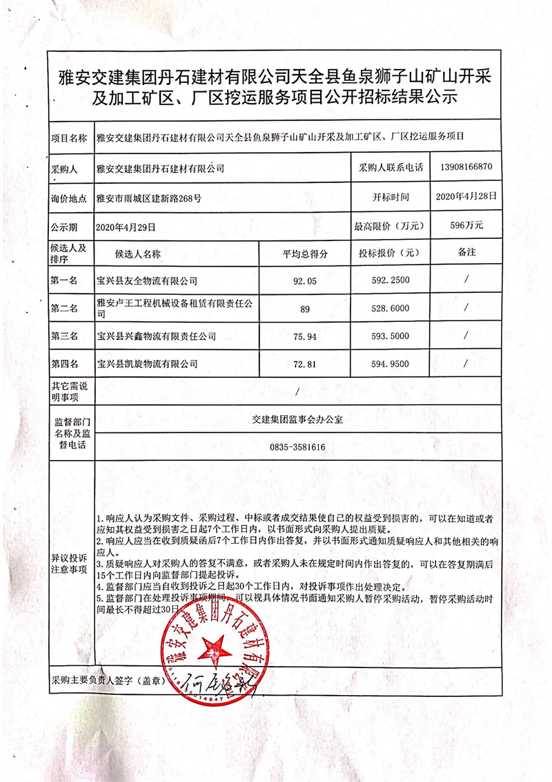 雅安交建集團(tuán)丹石建材有限公司天全縣魚泉獅子山礦山開(kāi)采及加工礦區(qū)、廠區(qū)挖運(yùn)服務(wù)項(xiàng)目公開(kāi)招標(biāo)結(jié)果公示
