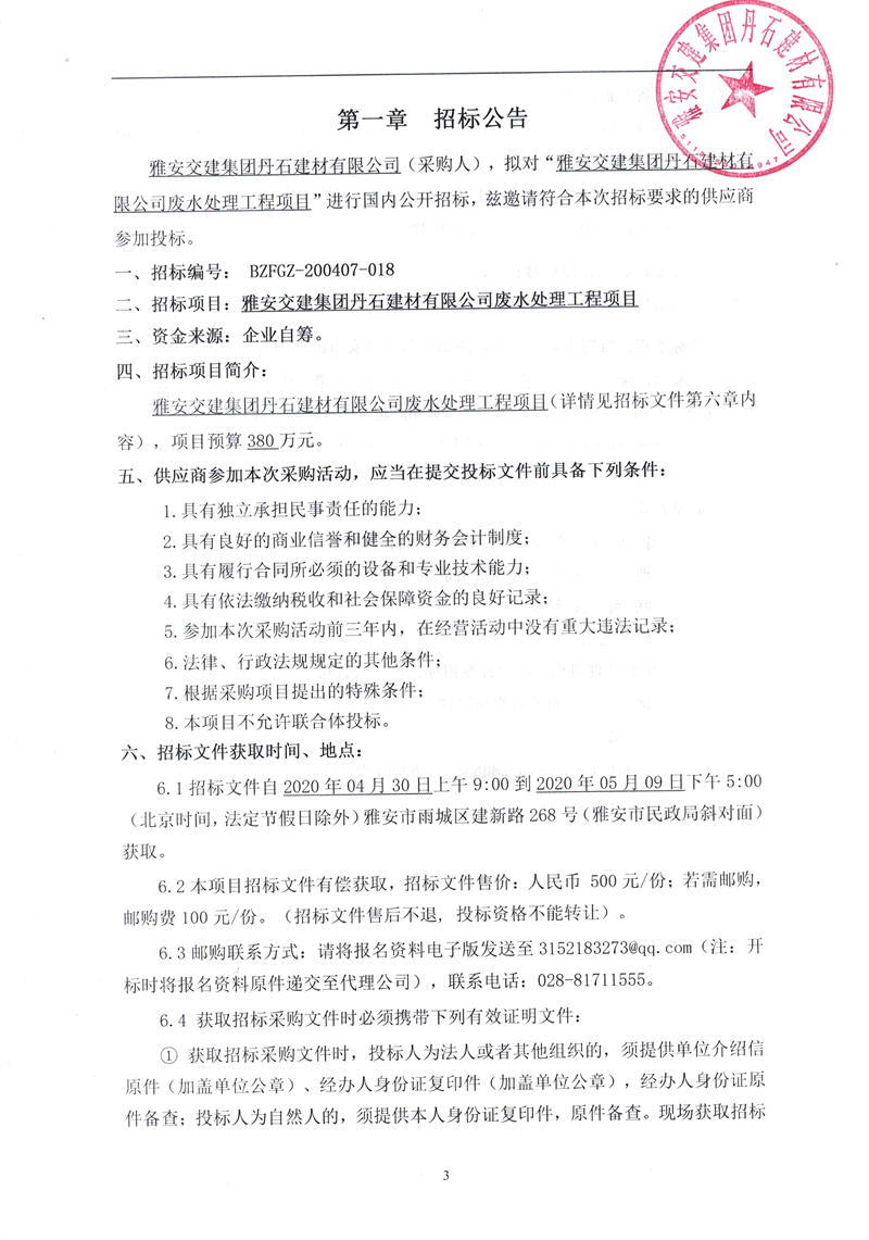 雅安交建集團丹石建材有限公司廢水處理工程項目招標公告