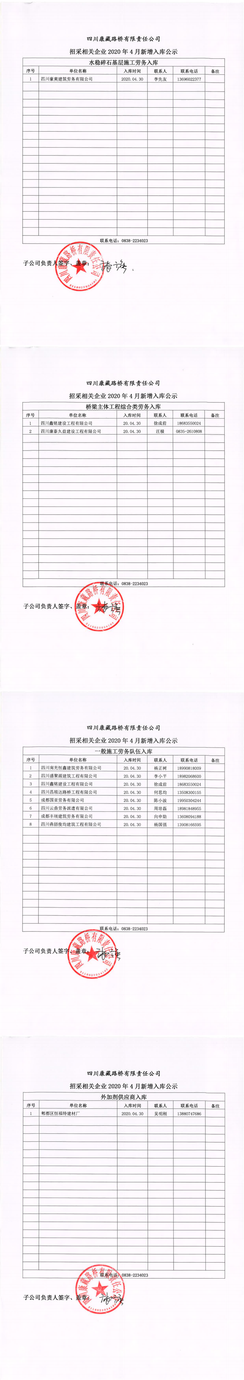 四川康藏路橋有限責(zé)任公司招采相關(guān)企業(yè)2020年4月新增入庫公示