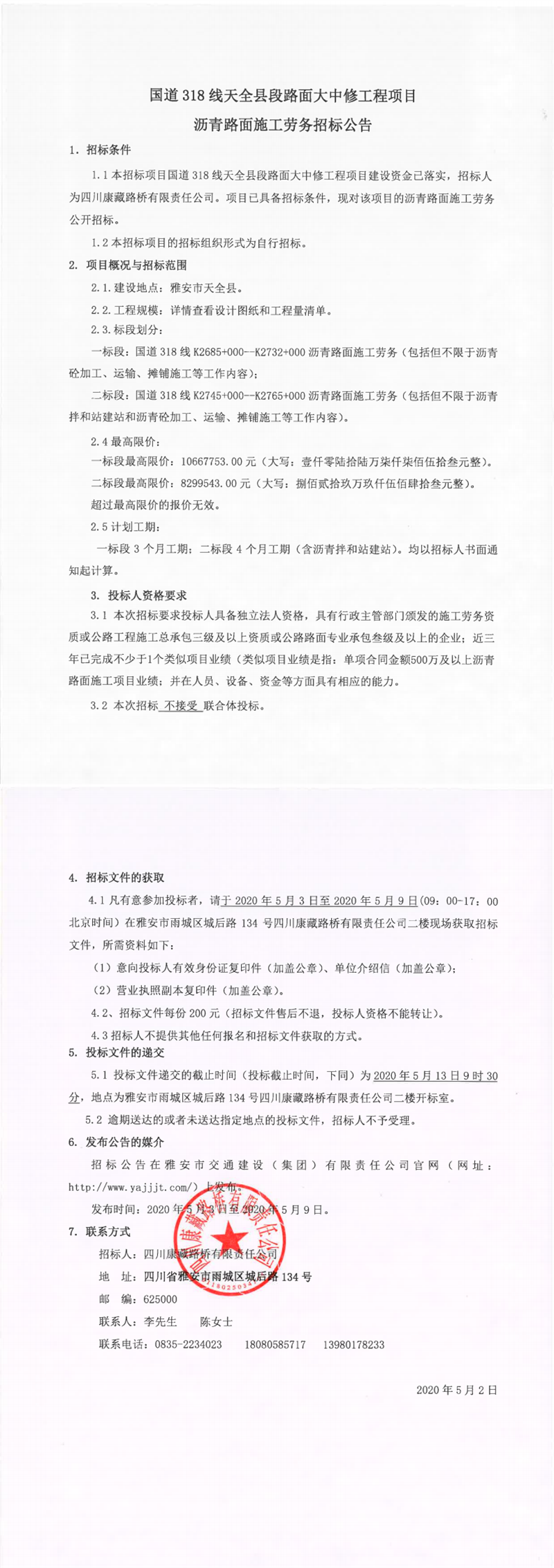 四川康藏路橋有限責(zé)任公司國(guó)道318線(xiàn)天全縣段路面大中修工程項(xiàng)目瀝青路面施工勞務(wù)招標(biāo)公告