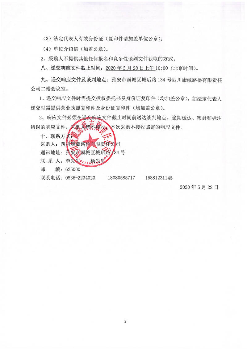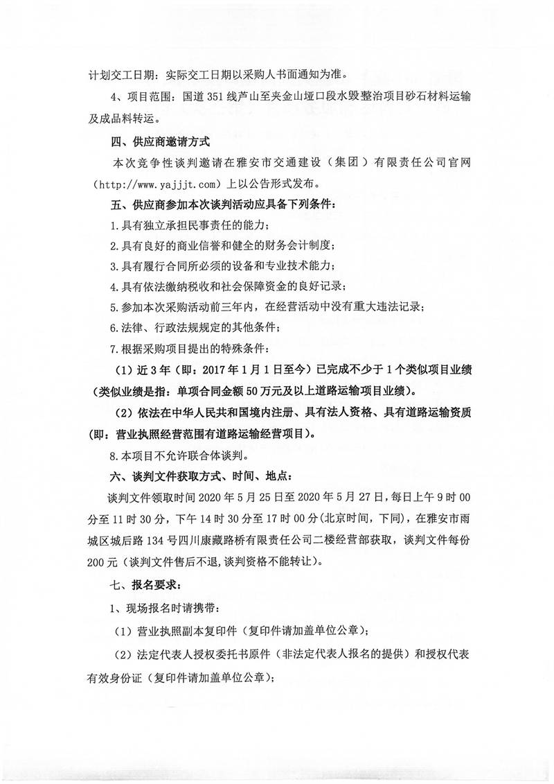 四川康藏路橋有限責(zé)任公司國道351線蘆山至夾金山埡口段8.22水毀項目砂石材料運輸服務(wù)項目(第三次)談判公告