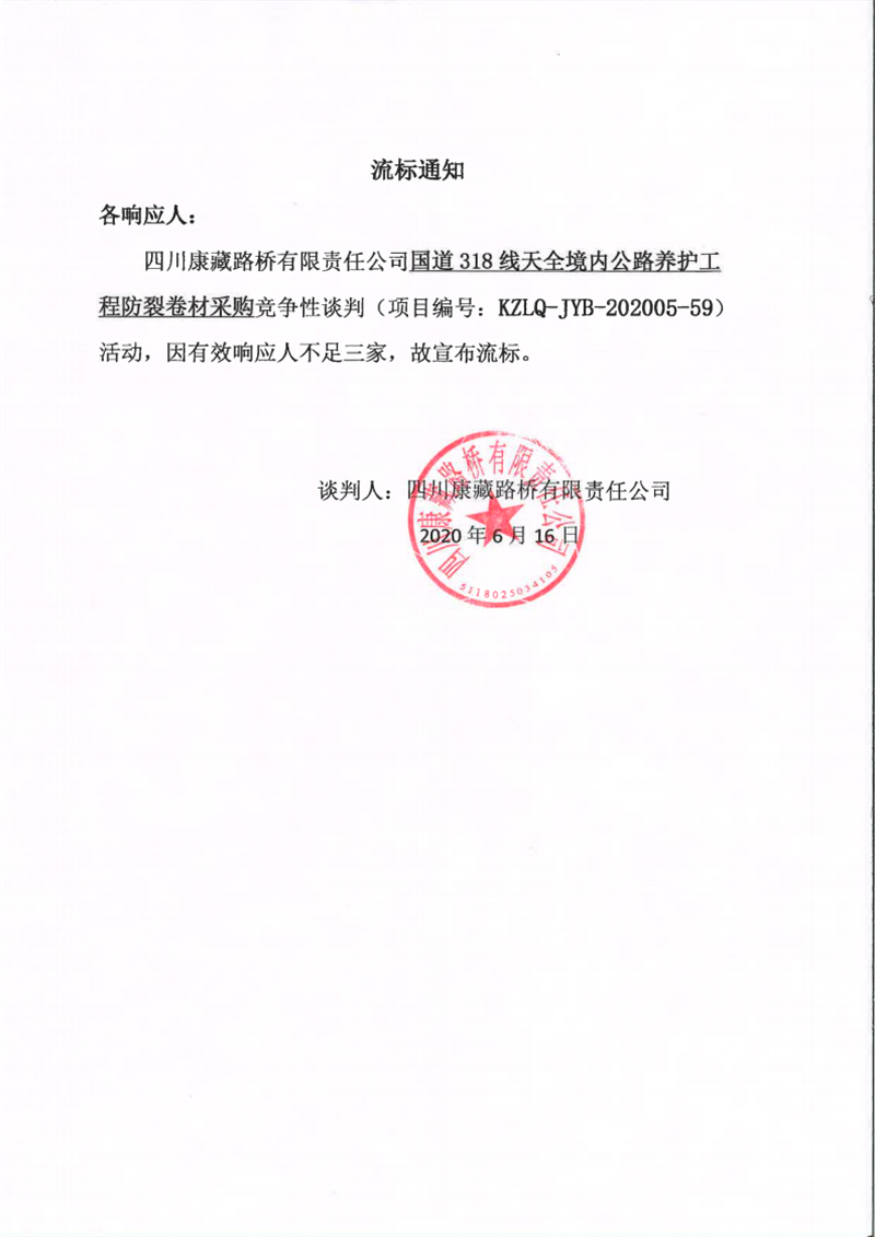 四川康藏路橋有限責任公司國道318線天全境內公路養(yǎng)護工程防裂卷材采購流標通知