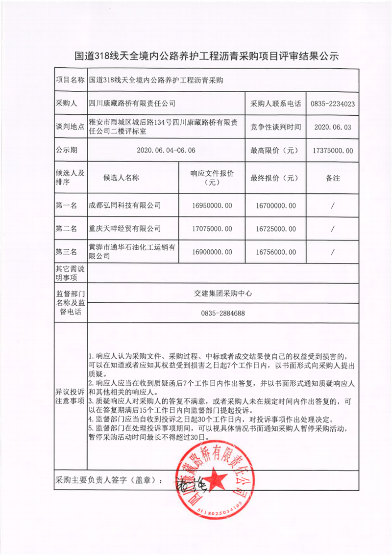 四川康藏路橋有限責(zé)任公司國道318線天全境內(nèi)公路養(yǎng)護(hù)工程瀝青采購項目評審結(jié)果公示